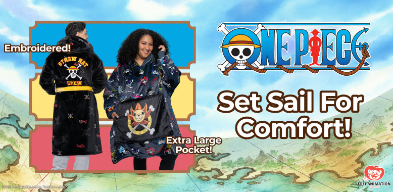 Woman wearing a purple plush hoodie holding a light blue quilted blanket on a maroon couch