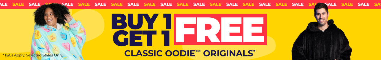 Smiling person wrapped in a blue blanket with white clouds sitting on a couch